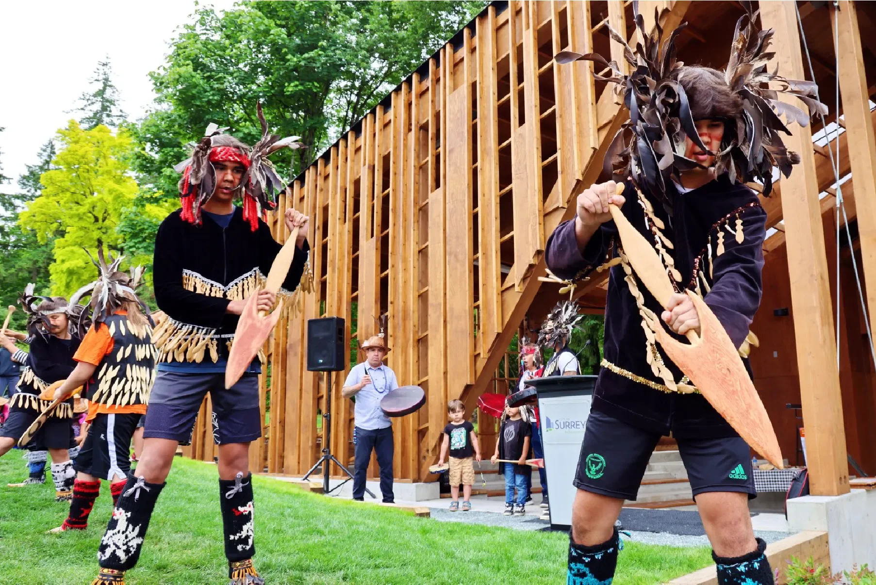 The work took place under the guidance of the Semiahmoo First Nation, through the City of Surrey’s cultural liaison. For Mike, O4’s principal and lead designer on this project, a few early meetings with Chief Chappell stayed with him. They weren’t planned as design sessions, but conversations to learn. Stories about family, about how knowledge is passed on through art and carving, and about a deep connection to land and place.